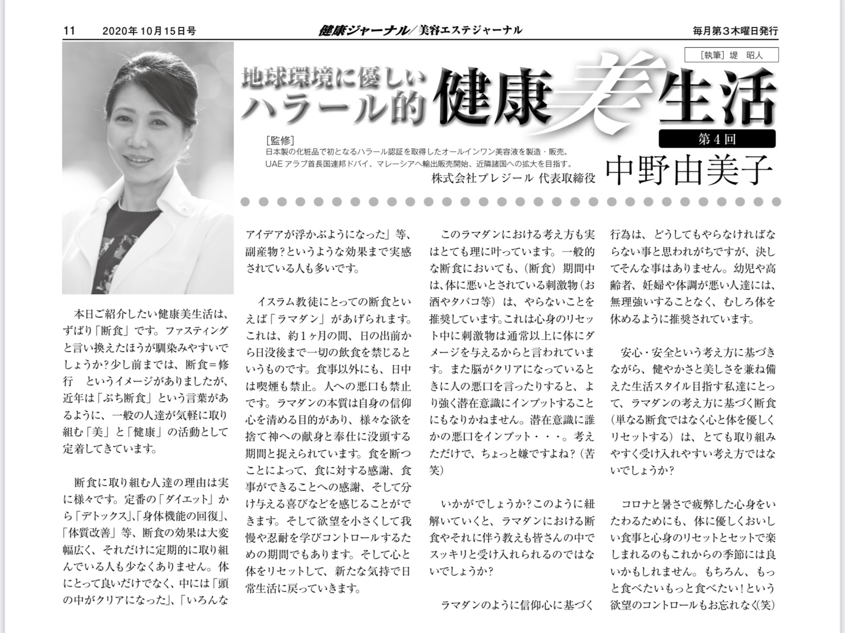 2020.10.15 【健康/美容エステジャーナル】 10/15号「地球環境に優しいハラール的健康美生活」第4回連載 10月15日号 健康/美容エステジャーナル 「地球環境に優しいハラール的健康美生活」第4回目 健康ジャーナル様にてコラムの連載をさせていただいております。 このコラムを通して、ハラールというものが皆様にとってより身近に感じていただけますように。