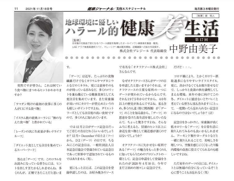 2021.11.18 【健康/美容エステジャーナル】11/18号「地球環境に優しいハラール的健康美生活」第17回連載 11月18日号 健康/美容エステジャーナル 「地球環境に優しいハラール的健康美生活」第17回 健康ジャーナル様にてコラムの連載をさせていただいております。 このコラムを通して、ハラールというものが皆様にとってより身近に感じていただけますように http://www.kenkou-j.com/health/column/halal/
