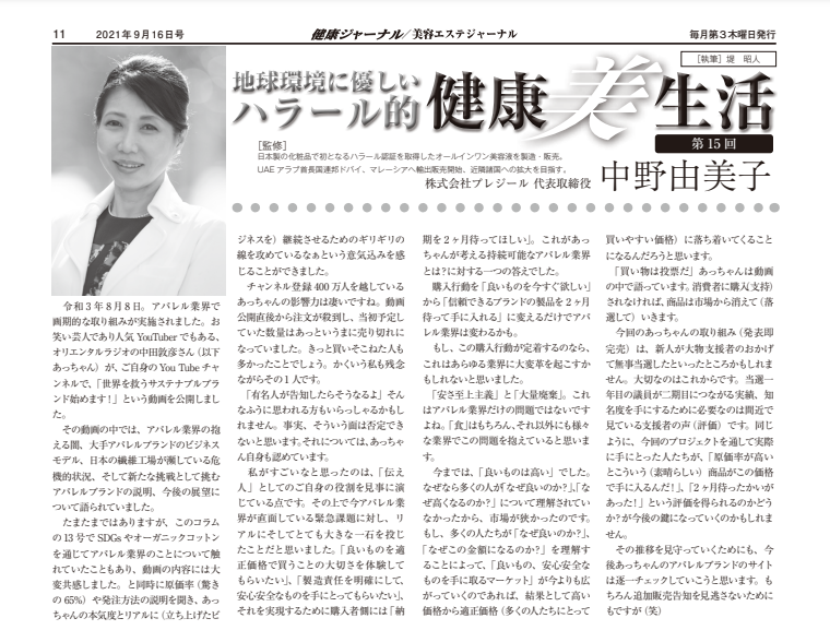 【健康/美容エステジャーナル】9/16号「地球環境に優しいハラール的健康美生活」第15回連載