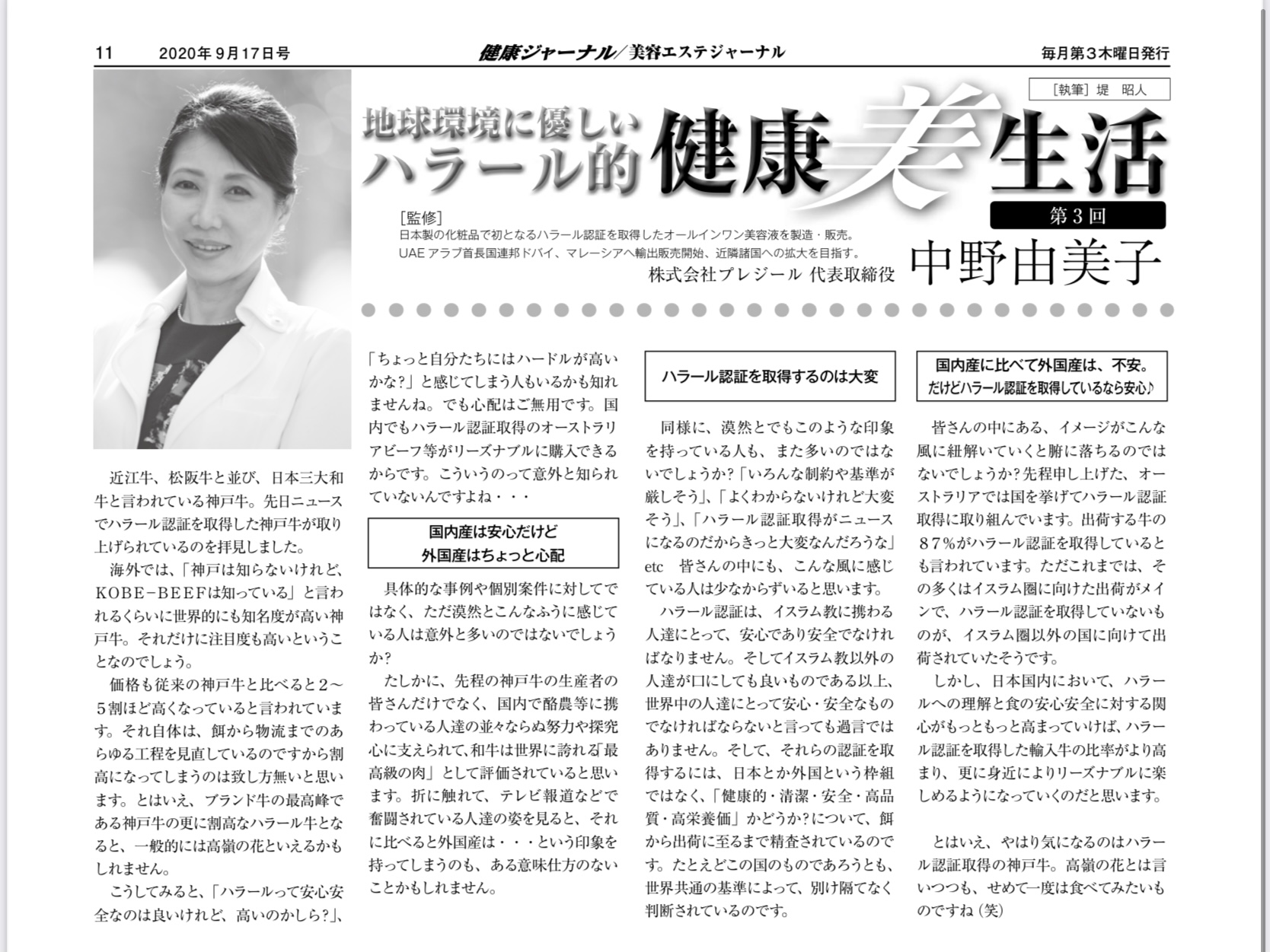 2020.09.20 【健康/美容エステジャーナル】 9/16号「地球環境に優しいハラール的健康美生活」第3回連載 9月16日号 健康/美容エステジャーナル 「地球環境に優しいハラール的健康美生活」第3回 健康ジャーナル様にてコラムの連載をさせていただいております。 このコラムを通して、ハラールというものが皆様にとってより身近に感じていただけますように。